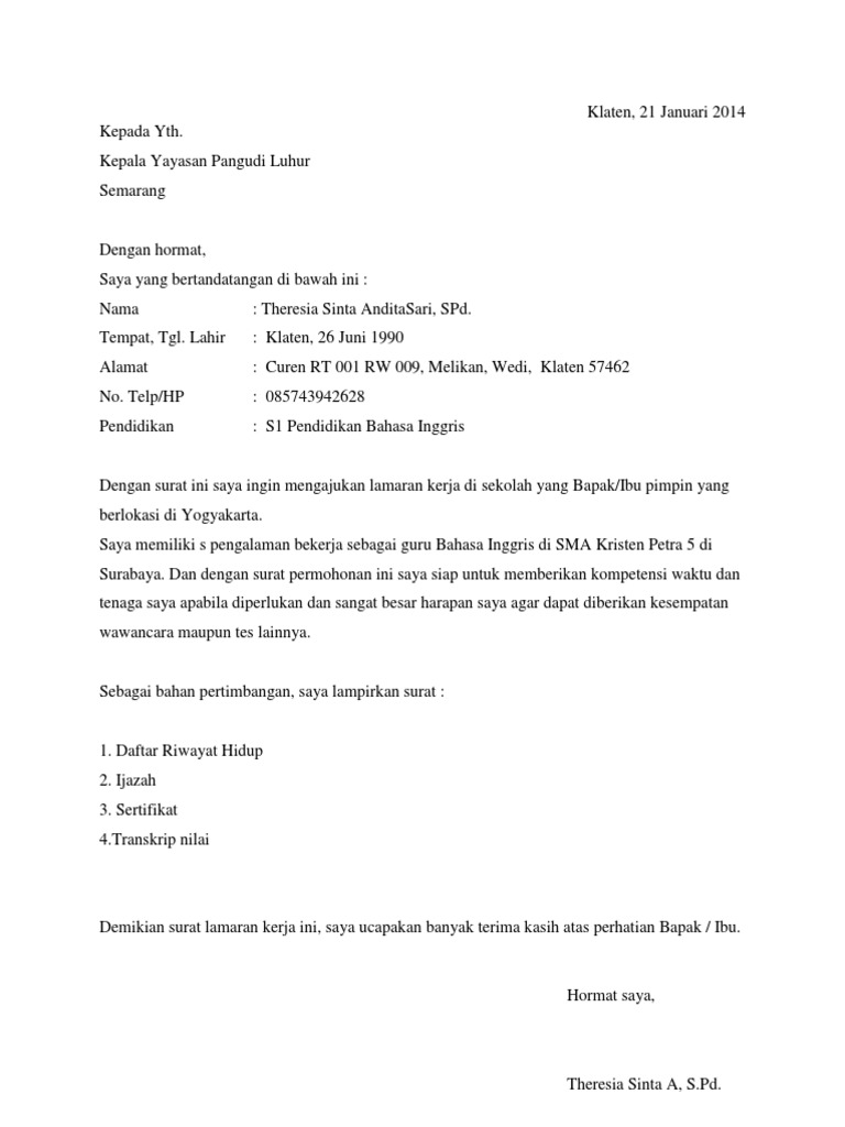 Bapak/ibu kepala smp negeri 1 sidoarjo. Tentu surat lamaran kerja guru, langsung tertuju pada posisi pengajar atau guru. Contoh surat lamaran kerja dalam bahasa inggris i. Saya mengajukan surat permohonan lamaran kerja untuk posisi pengajar di yayasan keluarga indonesia. Isi surat lamaran bisa berbeda tergantung dari posisi yang kita lamar.